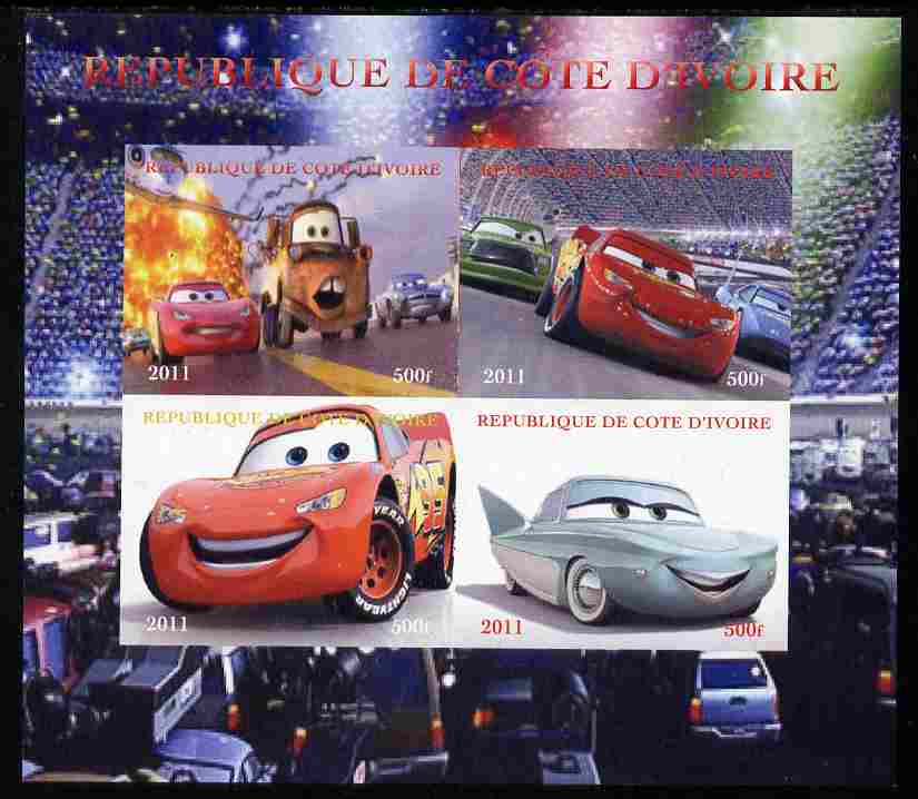 Ivory Coast 2011 Cars 2 imperf sheetlet containing 4 values unmounted mint. Note this item is privately produced and is offered purely on its thematic appeal