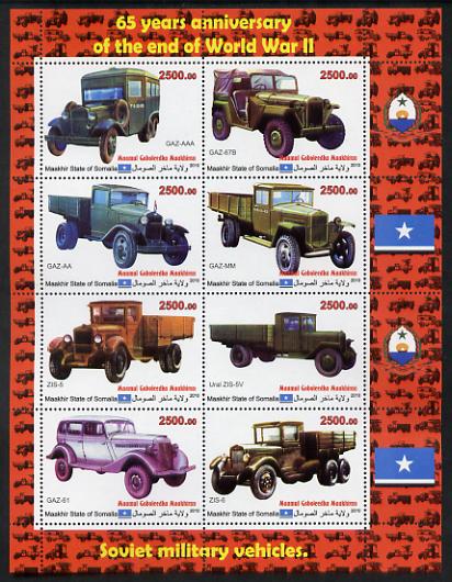 Maakhir State of Somalia 2010,65th Anniversary of the end of World War II #1 - Cars & Trucks imperf sheetlet containing 8 values unmounted mint