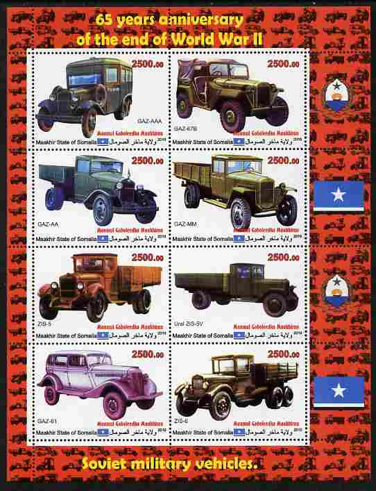 Maakhir State of Somalia 2010,65th Anniversary of the end of World War II #1 - Cars & Trucks perf sheetlet containing 8 values unmounted mint