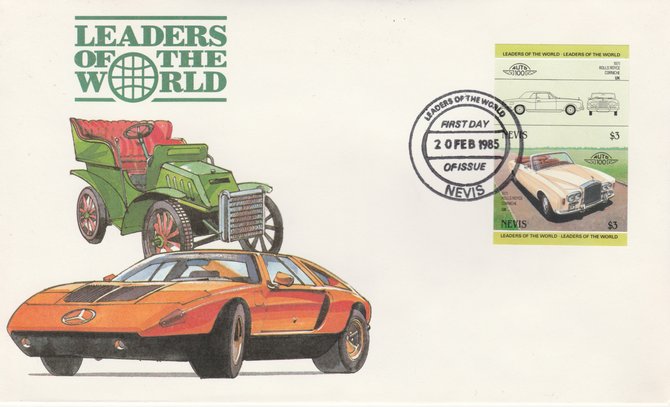 Nevis 1985 $3 Rolls Royce Corniche (1971) imperf se-tenant pair on illustrated cover with first day cancel (as SG 263a) very few imperfs are known on cover