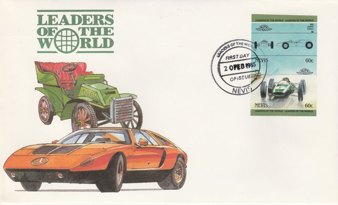 Nevis 1985 60c Cooper Climax (1960) imperf se-tenant pair on illustrated cover with first day cancel (as SG 257a) very few imperfs are known on cover