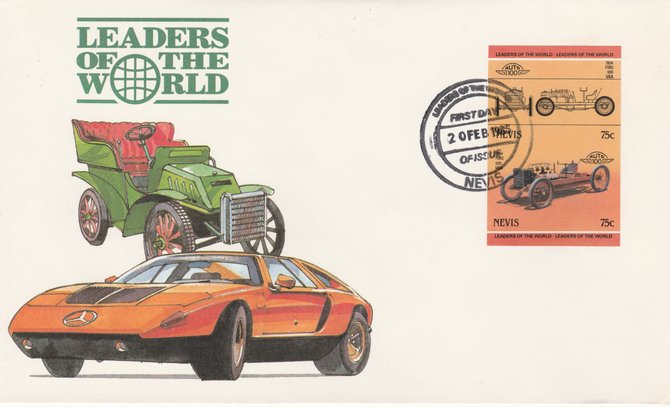 Nevis 1985 75c Ford 999 (1904) imperf se-tenant pair on illustrated cover with first day cancel (as SG 259a) very few imperfs are known on cover