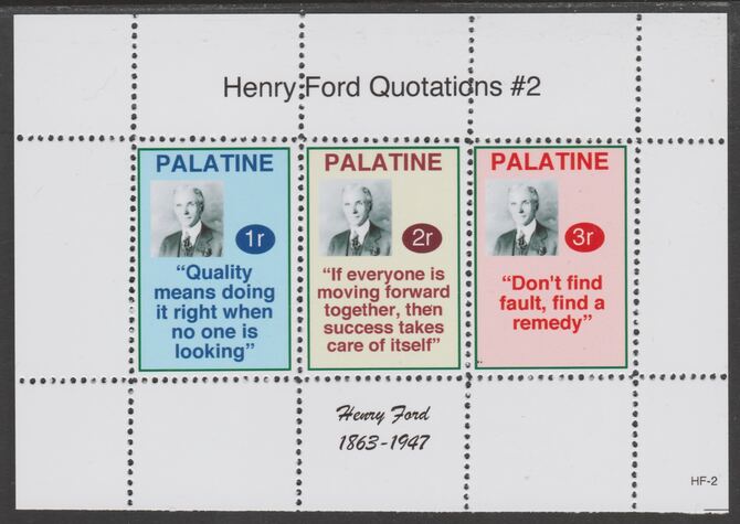Palatine (Fantasy) Quotations by Henry Ford #2 perf deluxe glossy sheetlet containing 3 values each with a famous quotation,unmounted mint