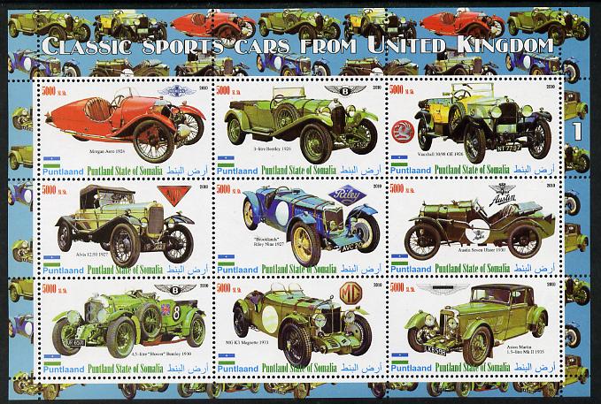 Puntland State of Somalia 2010 Classic Sports Cars of United Kingdom #2 perf sheetlet containing 9 values unmounted mint