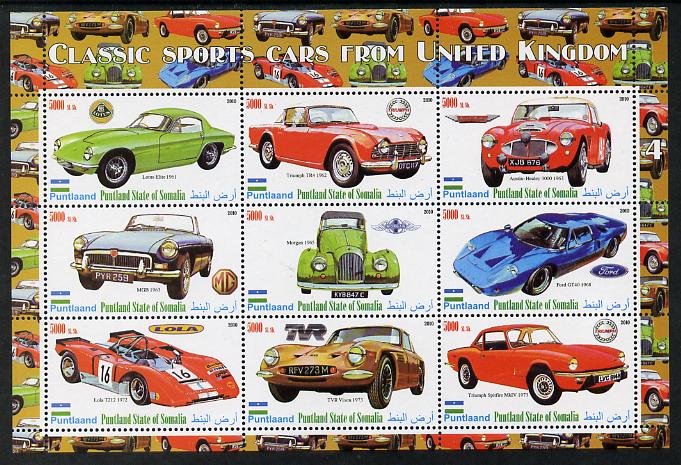 Puntland State of Somalia 2010 Classic Sports Cars of United Kingdom #4 perf sheetlet containing 9 values unmounted mint