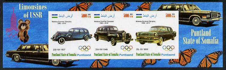 Puntland State of Somalia 2011 Limousines of the USSR #1 imperf sheetlet containing 3 values (Butterflies & Mosco Olympic Logo in margin) unmounted mint