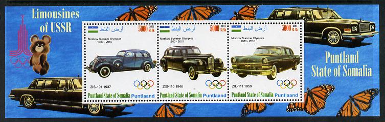 Puntland State of Somalia 2011 Limousines of the USSR #1 perf sheetlet containing 3 values (Butterflies & Mosco Olympic Logo in margin) unmounted mint