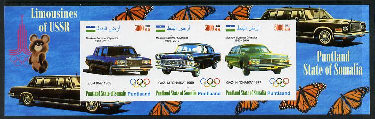 Puntland State of Somalia 2011 Limousines of the USSR #2 imperf sheetlet containing 3 values (Butterflies & Mosco Olympic Logo in margin) unmounted mint