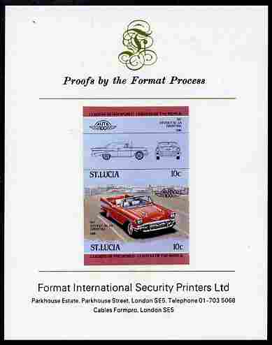 St Lucia 1984 Cars #1 (Leaders of the World) 10c Chevrolet Bel Air 1957 imperf se-tenant proof pair mounted on Format International proof card