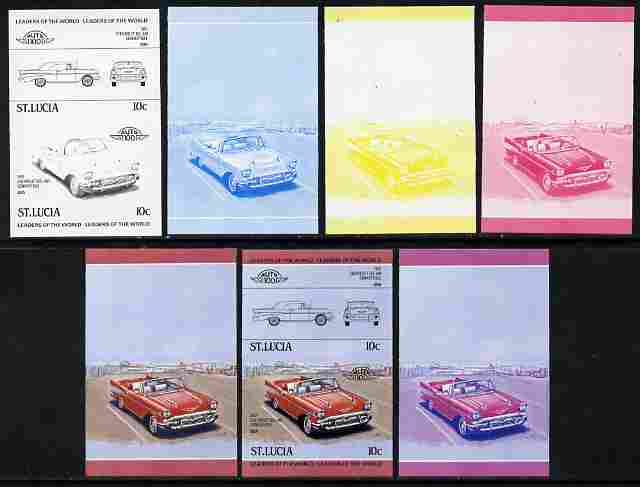 St Lucia 1984 Cars #1 (Leaders of the World) 10c Chevrolet Bel Air 1957 se-tenant pair - the set of 7 imperf progressive proofs comprising the 4 individual colours plus 2, 3 and all 4-colour composite, unmounted mint as SG 705a