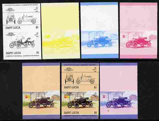 St Lucia 1984 Cars #2 (Leaders of the World) $1 Ford Model 'T' (1914) se-tenant pair - the set of 7 imperf progressive proofs comprising the 4 individual colours plus 2, 3 and all 4-colour composite, unmounted mint as SG 755a
