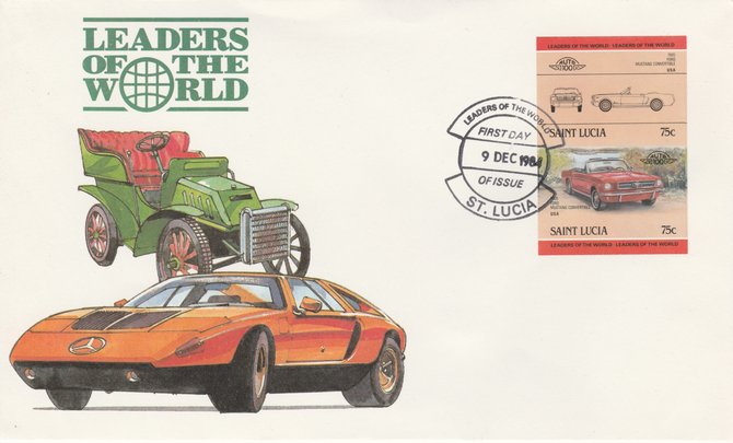 St Lucia 1984 Cars #2 (Leaders of the World) 75c Ford Mustang (1965) imperf se-tenant pair on illustrated cover with first day cancel (as SG 753a) very few imperfs are known on cover