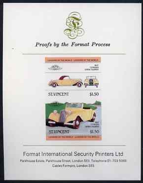 St Vincent 1983 $1.50 Citroen Tourer (1937) imperf se-tenant proof pair mounted on Format International proof card (as SG 731a)