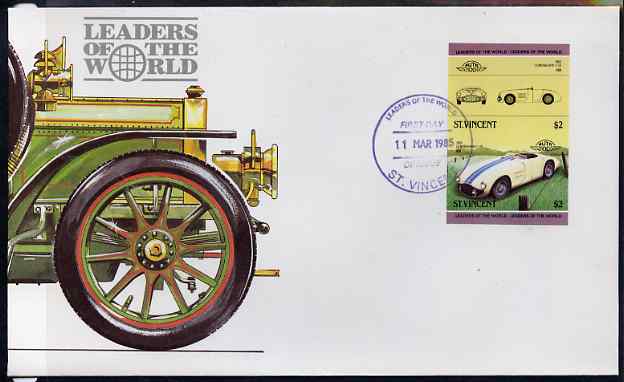 St Vincent 1985 Cars #3 (Leaders of the World) $2 Cunningham C-5R (1953) - imperforate se-tenant pair on illustrated cover with first day cancellation, as SG 866a very few imperfs are known on cover