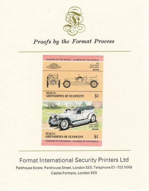 St Vincent - Bequia 1984 Cars #1 (Leaders of the World) $1 (1907 Rolls Royce) imperf se-tenant pair mounted on Format International proof card