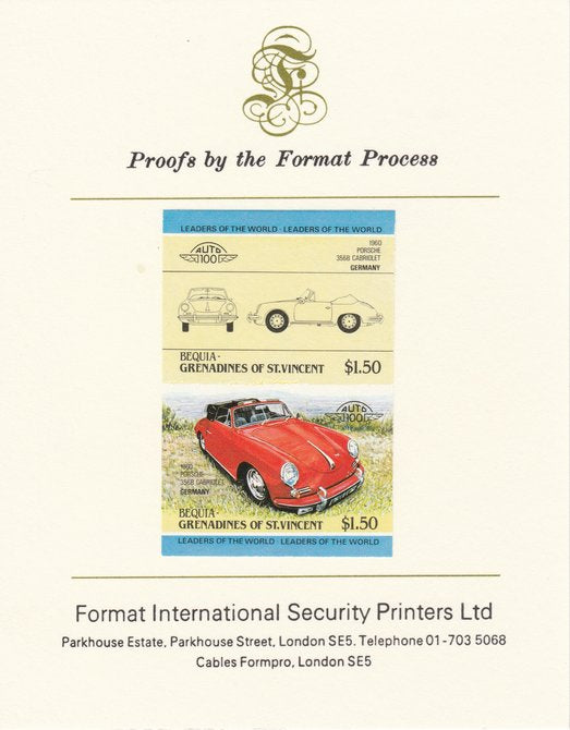 St Vincent - Bequia 1984 Cars #1 (Leaders of the World) $1.50 (1960 Porsche) imperf se-tenant pair mounted on Format International proof card