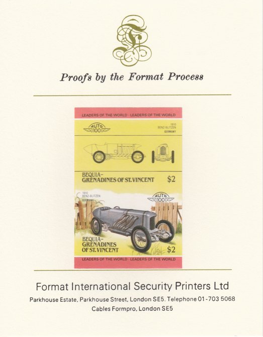 St Vincent - Bequia 1985 Cars #3 (Leaders of the World) $2 (Benz-Blitzen) imperf se-tenant pair mounted on Format International proof card
