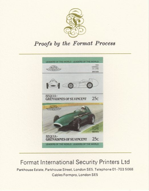 St Vincent - Bequia 1985 Cars #3 (Leaders of the World) 25c (1958 Vanwall 2.5 Litre) imperf se-tenant pair mounted on Format International proof card