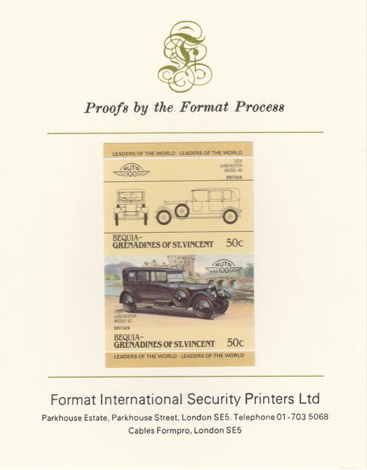St Vincent - Bequia 1985 Cars #3 (Leaders of the World) 50c (1924 Lanchester) imperf se-tenant pair mounted on Format International proof card