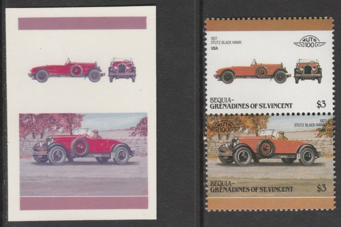 St Vincent - Bequia 1986 Cars #6 1927 Stutz $3 - Cromalin se-tenant die proof pair in red and blue only (missing Country name, inscription & value) ex Format International archives complete with issued stamp