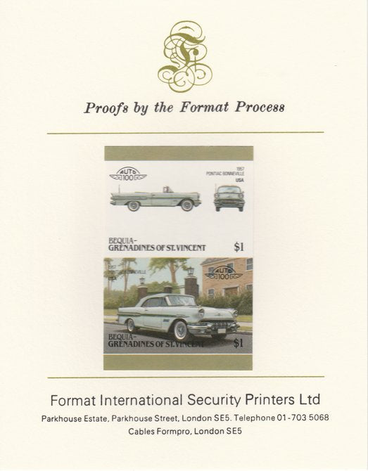 St Vincent - Bequia 1986 Cars #6 (Leaders of the World) $1 (1957 Pontiac Bonneville) imperf se-tenant pair mounted on Format International proof card