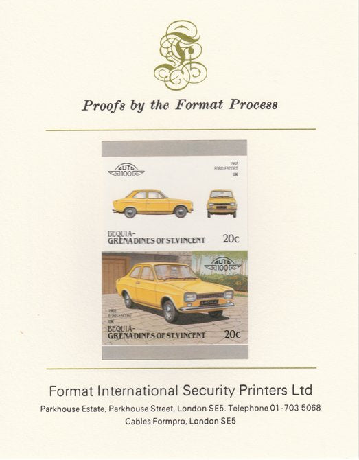 St Vincent - Bequia 1986 Cars #6 (Leaders of the World) 20c (1968 Ford Escort) imperf se-tenant pair mounted on Format International proof card
