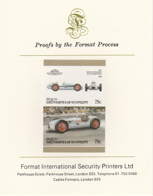 St Vincent - Bequia 1986 Cars #6 (Leaders of the World) 75c (1948 Moore-Offenhauser Special) imperf se-tenant pair mounted on Format International proof card
