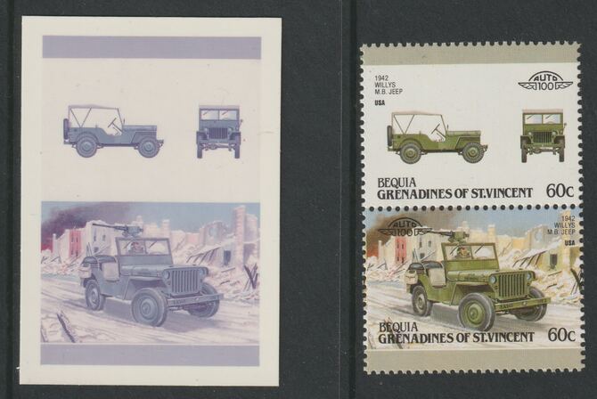 St Vincent - Bequia 1987 Cars #7 1942 Willys Jeep 60c - Cromalin se-tenant die proof pair in red and blue only (missing Country name, inscription & value) ex Format International archives complete with issued stamp