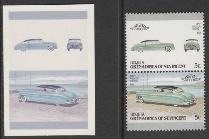 St Vincent - Bequia 1987 Cars #7 1952 Hudson Hornet 5c - Cromalin se-tenant die proof pair in red and blue only (missing Country name, inscription & value) ex Format International archives complete with issued stamp