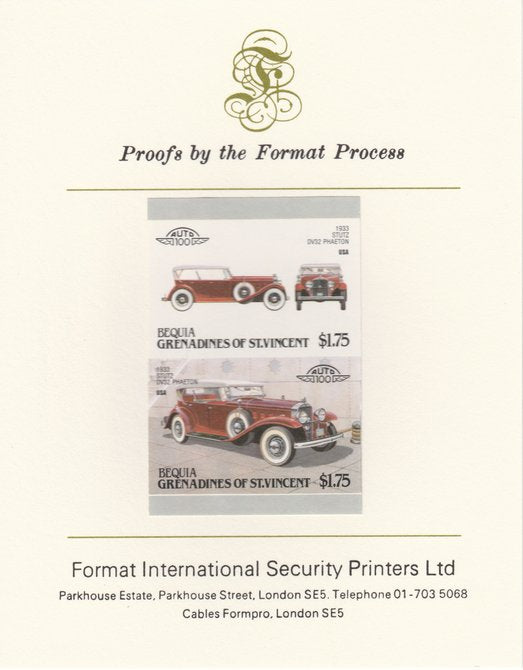 St Vincent - Bequia 1987 Cars #7 (Leaders of the World) $1.75 (1933 Stutz DV32 Phaeton) imperf se-tenant pair mounted on Format International proof card