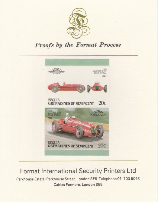 St Vincent - Bequia 1987 Cars #7 (Leaders of the World) 20c (1939 Maserati,8 CTF) imperf se-tenant pair mounted on Format International proof card