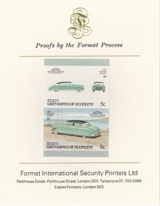 St Vincent - Bequia 1987 Cars #7 (Leaders of the World) 5c (1952 Hudson Hornet) imperf se-tenant pair mounted on Format International proof card