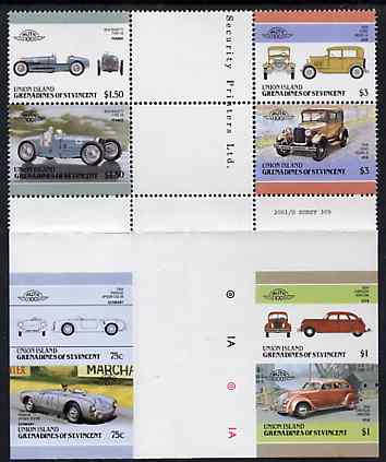 St Vincent - Union Island 1986 Cars #4 (Leaders of the World) se-tenant cross gutter block comprising $1 (1934 Chrysler), 75c (1954 Porsche), $3 (1928 Ford Model 'A') & $1.50 (1934 Bugatti), upper pair perf, lower pair imperf, folded through gutter & 75c & $1.50 pair creased but rare ex archive item unmounted mint