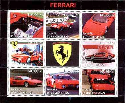 Turkmenistan 1999 Ferrari perf sheetlet containing set of 8 values plus label unmounted mint