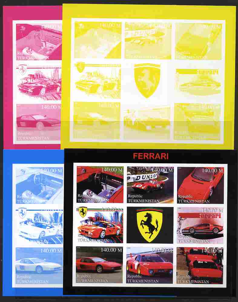 Turkmenistan 1999 Ferrari sheetlet containing set of 8 values plus,the set of 4 imperf progressive proofs comprising 3 individual colours plus all 4-colour composite, unmounted mint