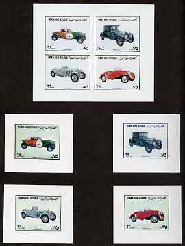 Yemen - Republic 1980 (?) Classic Cars imperf set of 8 plus two s/sheets each on Cromalin paper mounted in special folder by the printers, Ueberreuter, as SG 610-16