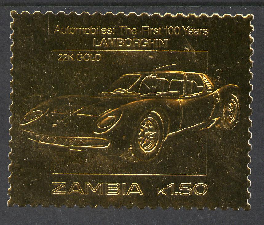 Zambia 1987 Classic Cars 1k50 Lamborghini in 22k gold foil unmounted mint