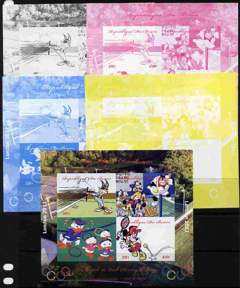 Benin 2011 The World of Walt Disney - Olympic Sports - Tennis sheetlet containing 4 values - the set of 5 imperf progressive proofs comprising the 4 individual colours plus all 4-colour composite, unmounted mint