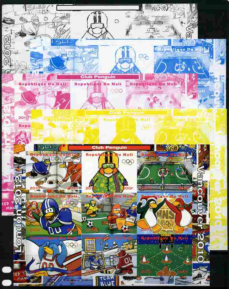 Mali 2010 Olympic Games - Disney Club Penguin #2 sheetlet containing 9 values - the set of 5 imperf progressive proofs comprising the 4 individual colours plus all 4-colour composite unmounted mint