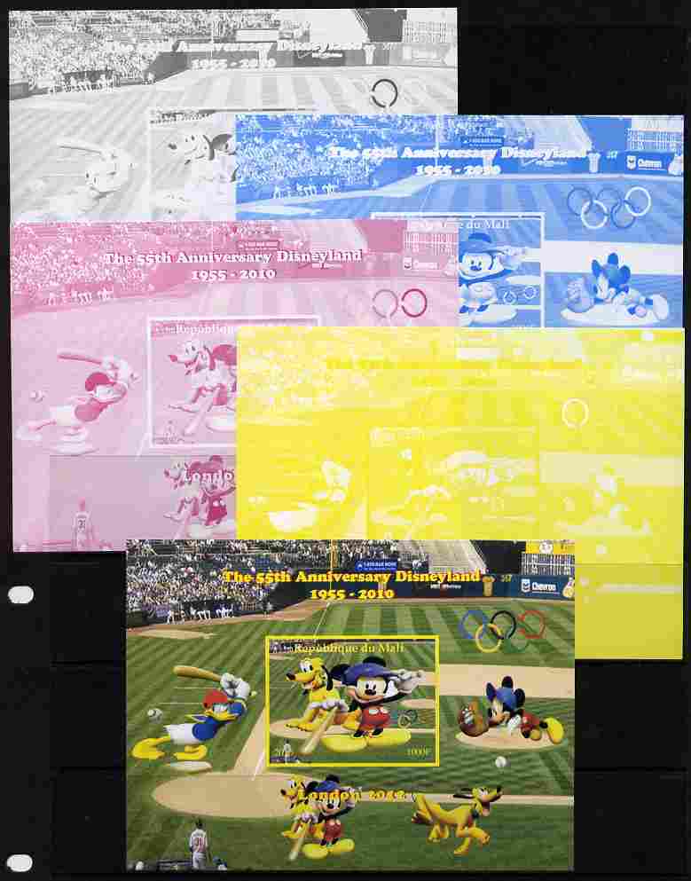 Mali 2010 The 55th Anniversary of Disneyland - Baseball #3 s/sheet - the set of 5 imperf progressive proofs comprising the 4 individual colours plus all 4-colour composite, unmounted mint