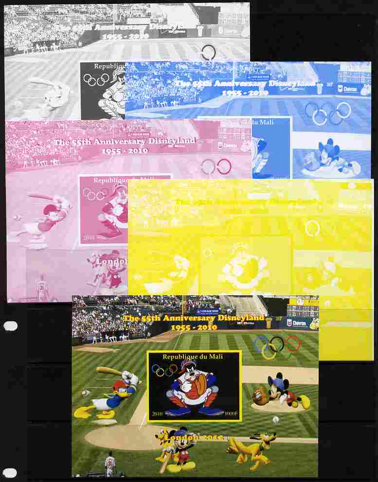Mali 2010 The 55th Anniversary of Disneyland - Baseball #6 s/sheet - the set of 5 imperf progressive proofs comprising the 4 individual colours plus all 4-colour composite, unmounted mint
