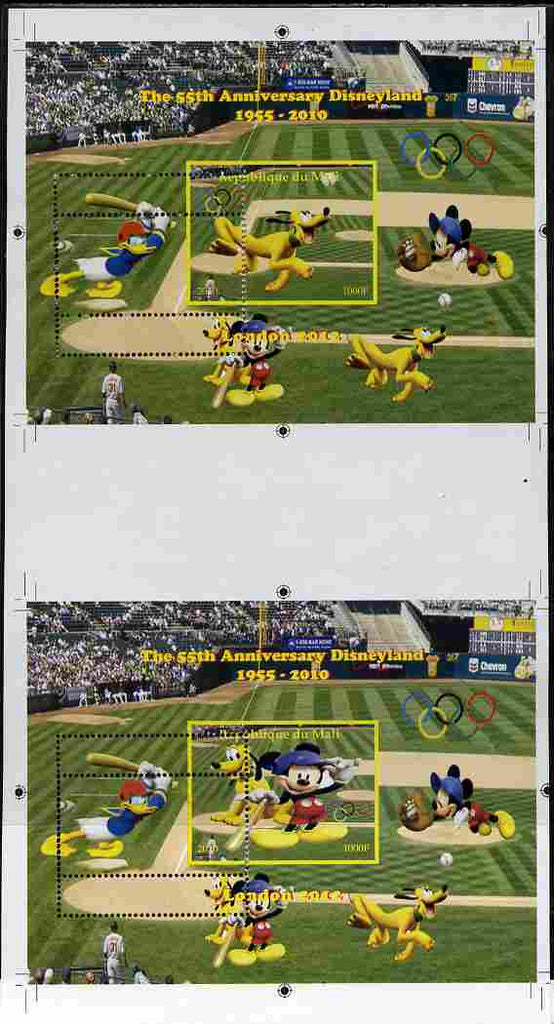 Mali 2010 The 55th Anniversary of Disneyland - Baseball s/sheets #2 & #3 se-tenant from uncut trial perf proof sheet (1 exists with perforations doubled both dramatically misplaced) unmounted mint