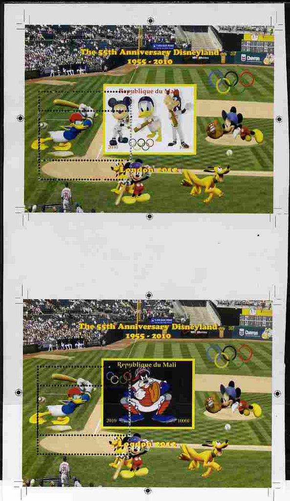 Mali 2010 The 55th Anniversary of Disneyland - Baseball s/sheets #4 & #6 se-tenant from uncut trial perf proof sheet (1 exists with perforations doubled both dramatically misplaced) unmounted mint