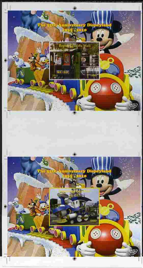 Mali 2010 The 55th Anniversary of Disneyland - Mickey Mouse Railway s/sheets #05 & #06 se-tenant from uncut imperf proof sheet (3 exist) unmounted mint