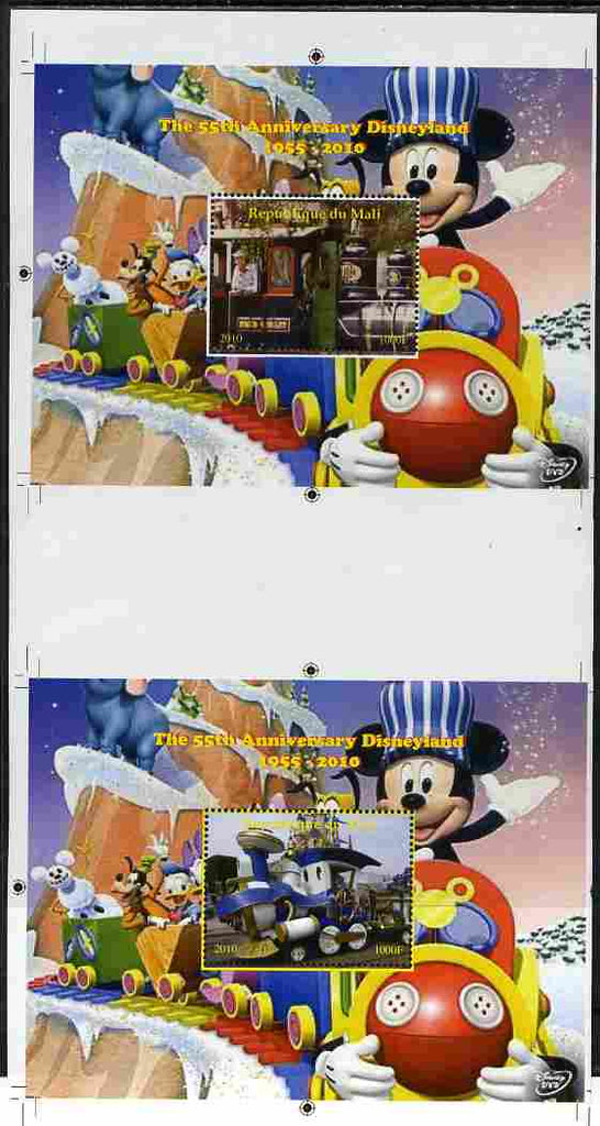 Mali 2010 The 55th Anniversary of Disneyland - Mickey Mouse Railway s/sheets #05 & #06 se-tenant from uncut perf proof sheet (2 exist with perforations slightly misplaced) unmounted mint