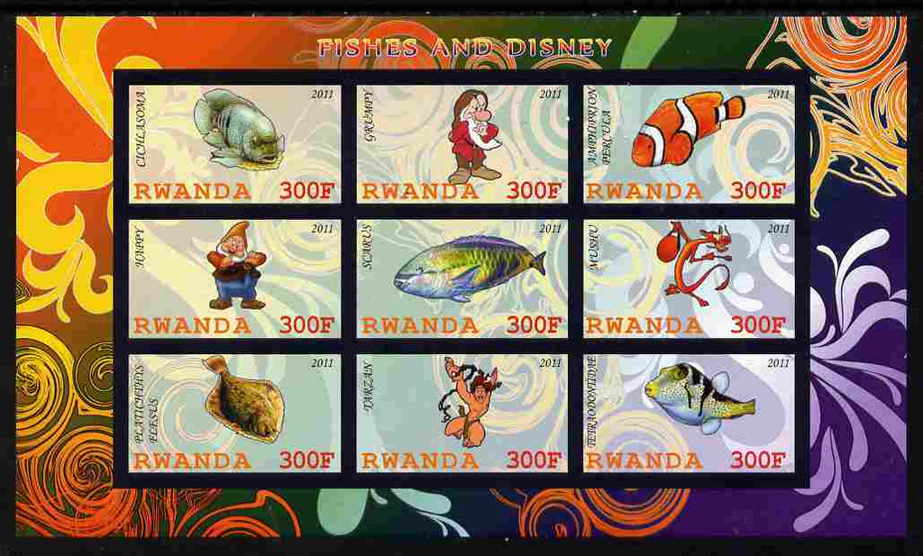 Rwanda 2011 Fish & Disney Characters #1 imperf sheetlet containing 9 values unmounted mint