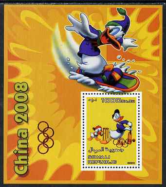 Somalia 2006 Beijing Olympics (China 2008) #06 - Donald Duck Sports - Cricket & Surf Boarding perf souvenir sheet unmounted mint with Olympic Rings overprinted on stamp and in margin at lower left