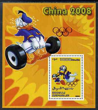 Somalia 2006 Beijing Olympics (China 2008) #07 - Donald Duck Sports - Weightlifting & American Football perf souvenir sheet unmounted mint with Olympic Rings overprinted on stamp and in margin at upper right