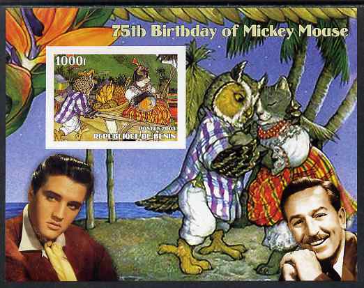 Benin 2003 75th Birthday of Mickey Mouse - The Owl & the Pussy Cat #3 (also shows Elvis & Walt Disney) imperf m/sheet unmounted mint. Note this item is privately produced and is offered purely on its thematic appeal