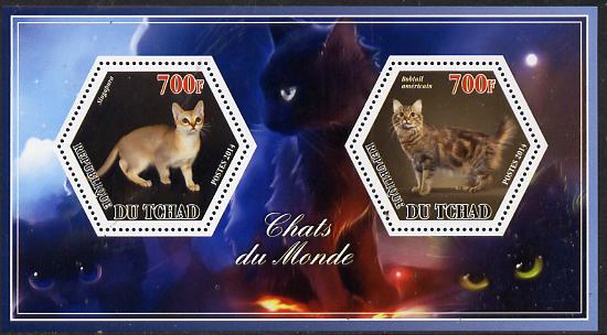 Chad 2014 Cats #2 perf sheetlet containing two hexagonal-shaped values unmounted mint
